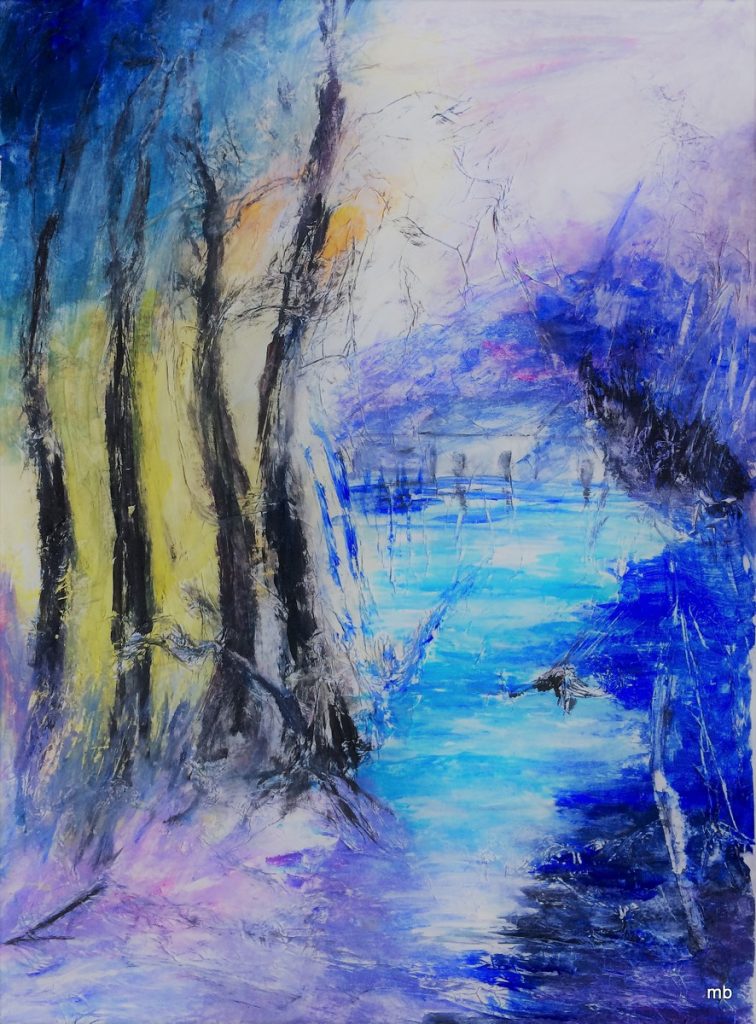 Unsere Dozentin Annemarie hat mich motiviert den Maluntergrund zunächst mal mit zerknittertem Seidenpapier zu bekleben. So hat das Papier eine interessante, zufällige Struktur und das Wintermotiv dadurch etwas „Frostiges“ bekommen.