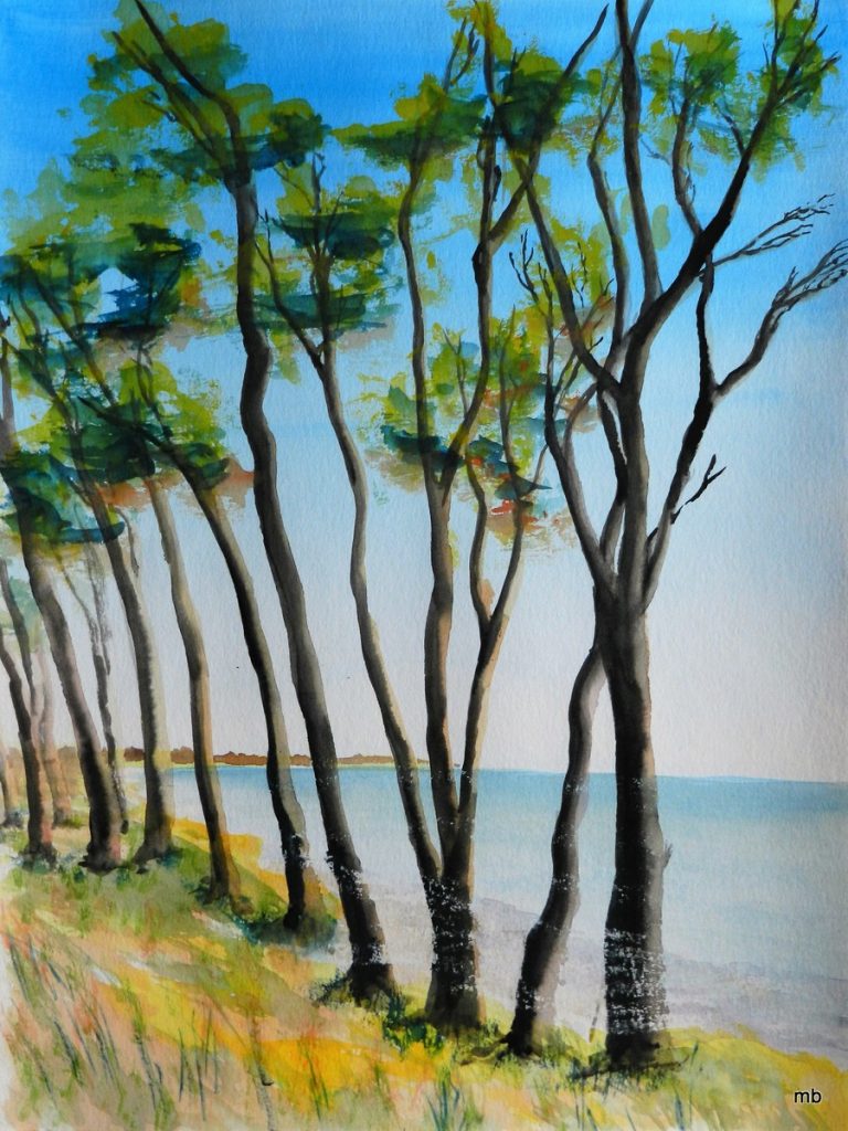 Für den Juli habe ich ein Aquarell aus diesem Urlaub ausgewählt. Das Motiv gibt einen Blick von der Steilküste im Darßer Wald wieder.