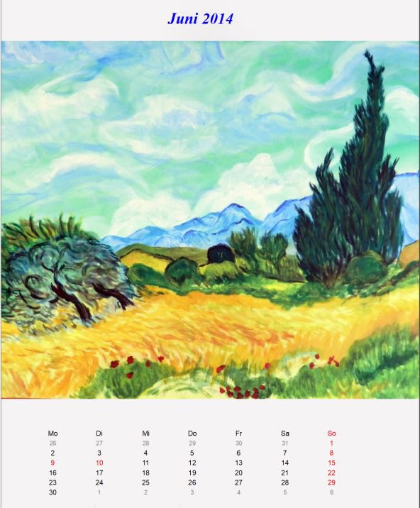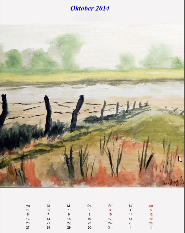 Weiterhin stehen hauptsächlich Aquarellbilder im Vordergrung. Aus der Beschäftigung mit den Impressionisten in 2010 habe ich meine daraus entstandenen Versuche wie Strandweg und Abendstimmung am Meer und auch mein Lieblingsbild von van Gogh (d.h. meine Kopie) ausgewählt. Eigentlich geht aber inzwischen meine Vorliebe zur expressionistischen Ausdrucksweise (am hohen Ufer, Kirchweg, Segelboote).