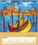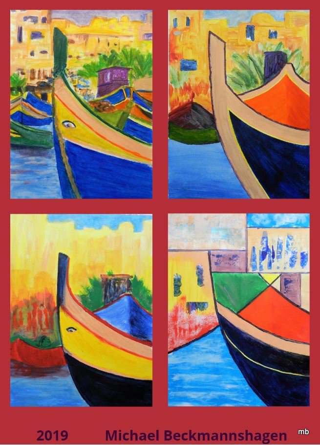 Im Gegensatz zu 2017, wo ich mit dem Zufall gespielt habe (Beispiel März-Blatt 2019) und darüber spannende Ergebnisse erzielte war der Ansatz in 2018 eher prozessorientiert: vom Abbild zur Abstraktion. Ein gutes Beispiel dafür ist das Titelblatt, wo ich unsere Urlaubseindrücke aus Malta, dem Hafen von Marsaxlokk, in Schritten immer weiter reduziert und somit abstrahiert habe.