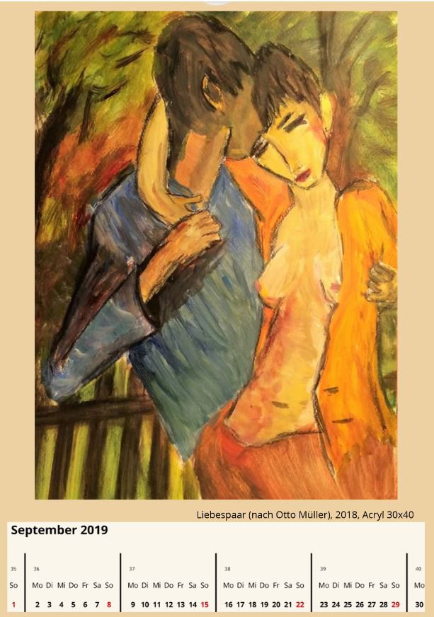 September 2019: Liebespaar (nach Otto Müller) Gerne nehme ich mir auch die Gemälde der großen Meister zur Vorlage. Hier haben es mir vor allem die Expressionisten angetan, so auch Otto Müller. Das Gemälde „Liebespaar“ hat mich von der Stimmung und den Farben so stark angesprochen, dass ich es gerne „nachgemalt“ habe. Lies mehr… |