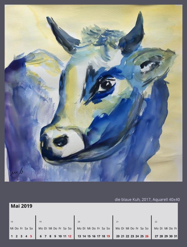 Mai 2019: die blaue Kuh Resis Patentochter hat sich ein Bild von einer Kuh gewünscht. Eigentlich tue ich mich schwer mit „Auftragsarbeiten“, aber nach ein bisschen Suche im Internet fand ich ein schönes Foto einer Kuh, welches mich als „Modell“ inspirierte. Lies mehr… |