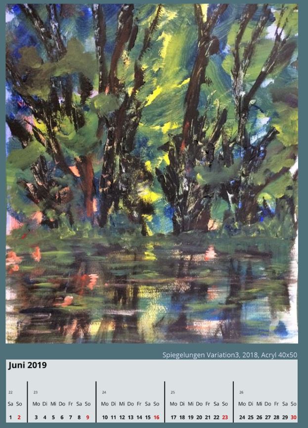 Juni 2019: Spiegelung Variation IV Die Spiegelungen in einem Waldsee sind ein wiederkehrendes Motiv, welches mir viel Raum für den spontanen und emotionalen Umgang mit Formen und Farben bietet. Im Sommerworkshop 2017 habe ich „per Zufall“ mein erstes Bild mit dem Thema „Spiegelungen“ gemalt. Lies mehr… |