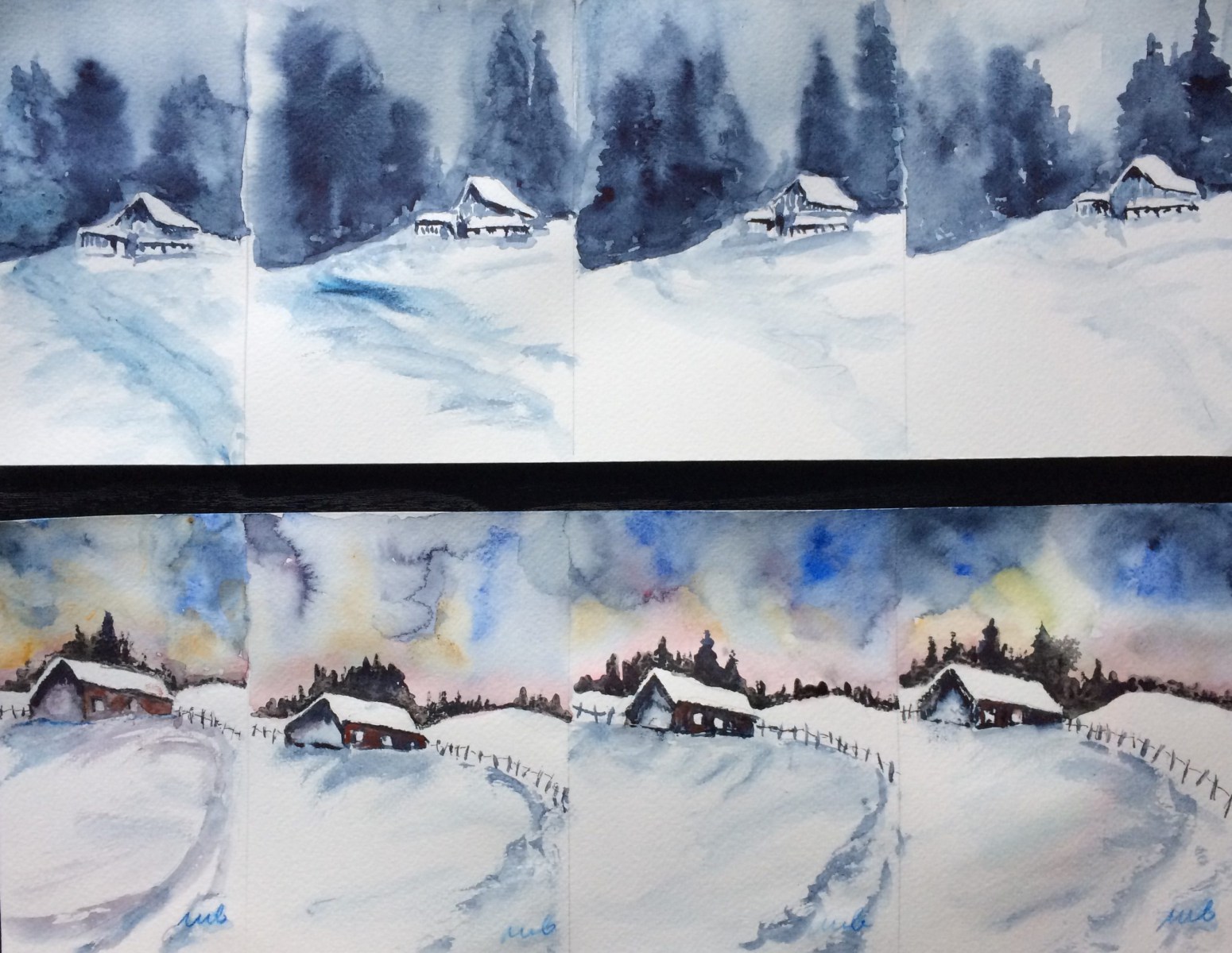 Diese Abstinenz hat mich dann motiviert im Dezember noch ein paar Schneebilder in größerer Anzahl im Grusskartenformat anzufertigen. Eigentlich macht es Spass auf Aquarell Schnee zu malen, man lässt das Weiss des Papiers stehen und malt dann drumherum, quasi Negativkonturen. Mit trockenen und feuchten Flächen muss man dabei vorsichtig hantieren. In dem kleinen Format war das wie eine schöne kleine Studien-Sequenz.