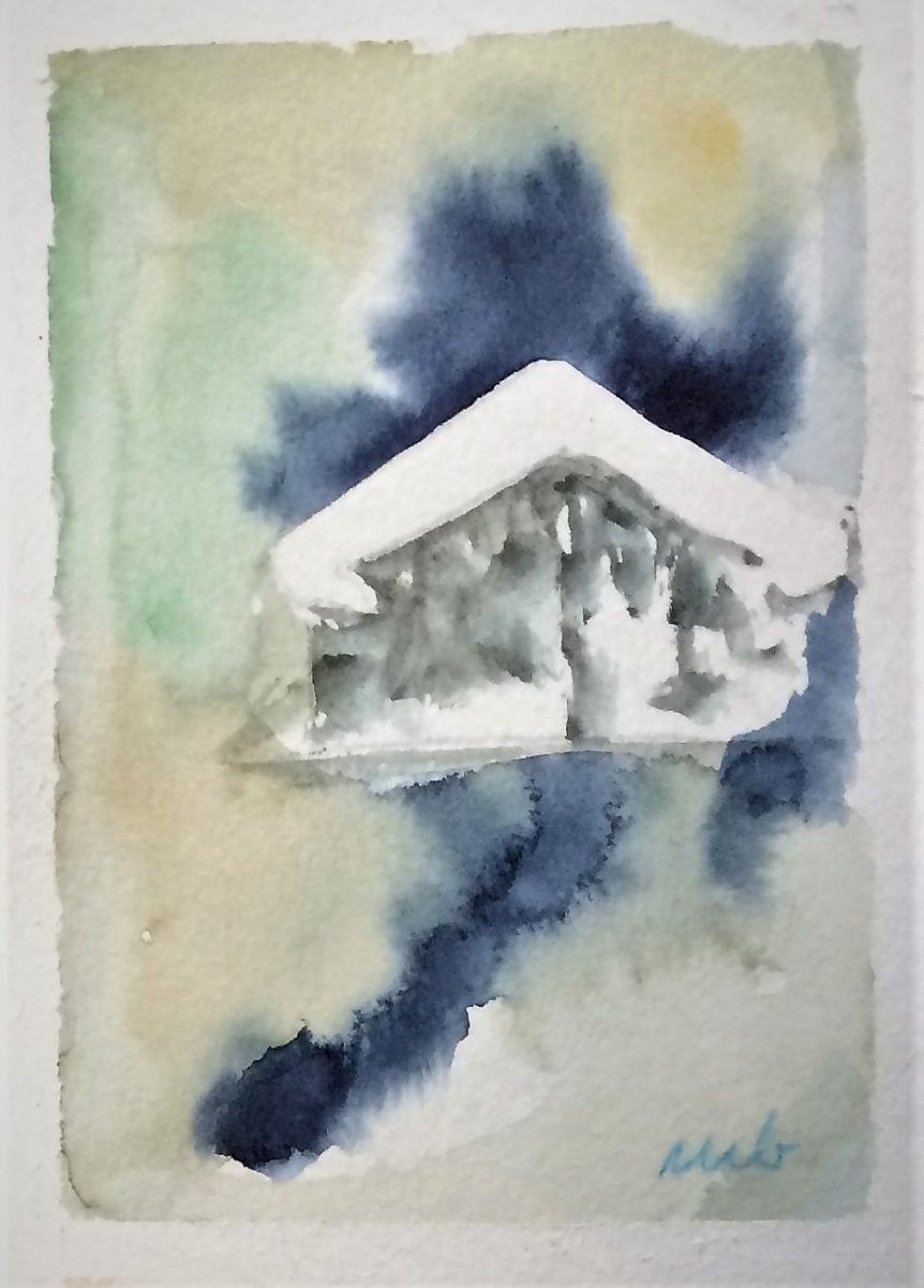 Diese Abstinenz hat mich dann motiviert im Dezember noch ein paar Schneebilder in größerer Anzahl im Grusskartenformat anzufertigen. Eigentlich macht es Spass auf Aquarell Schnee zu malen, man lässt das Weiss des Papiers stehen und malt dann drumherum, quasi Negativkonturen. Mit trockenen und feuchten Flächen muss man dabei vorsichtig hantieren. In dem kleinen Format war das wie eine schöne kleine Studien-Sequenz.