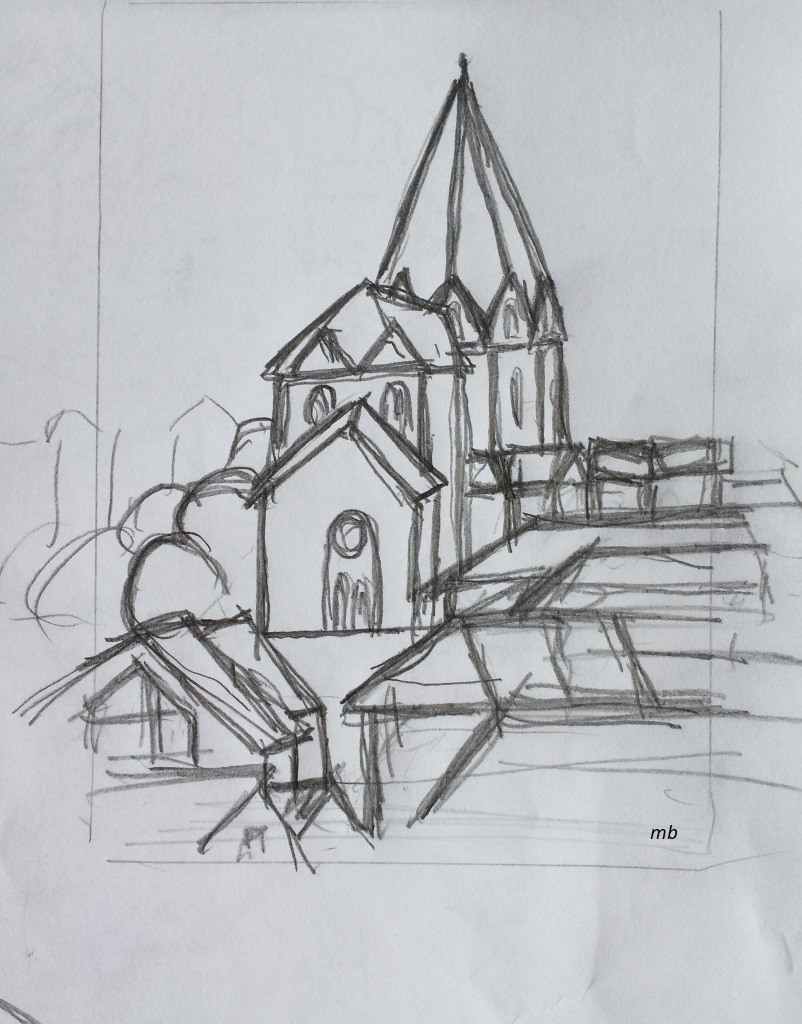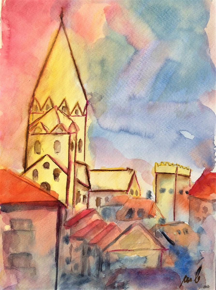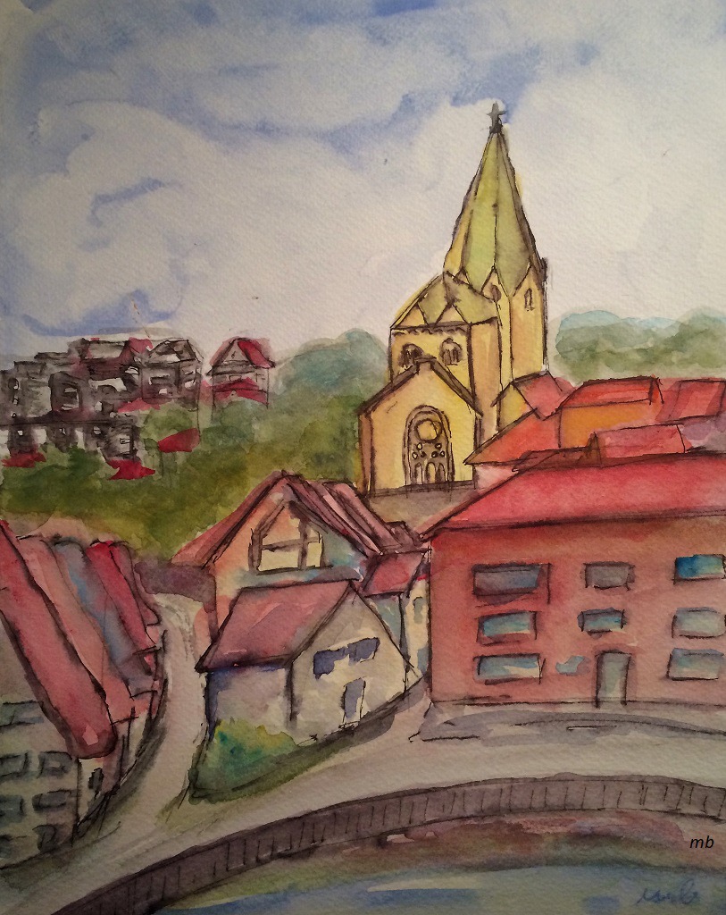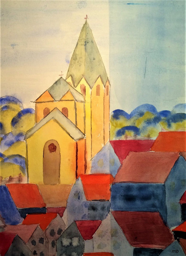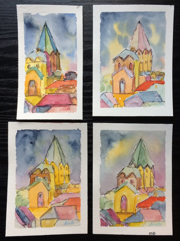 Zwischendurch habe ich auch mal die Abtei aus einer anderen Perspektive betrachtet und gemalt. Und ich habe das Motiv auch für Grusskarten genutzt. Einer schöner Anreiz, um statt Mails vielleicht auch mal wieder einen handgeschriebenen/gemalten Gruss zu versenden.