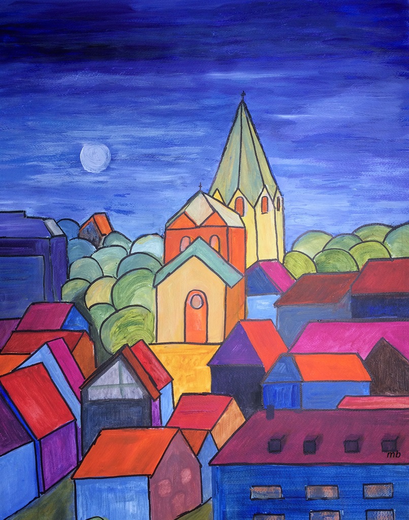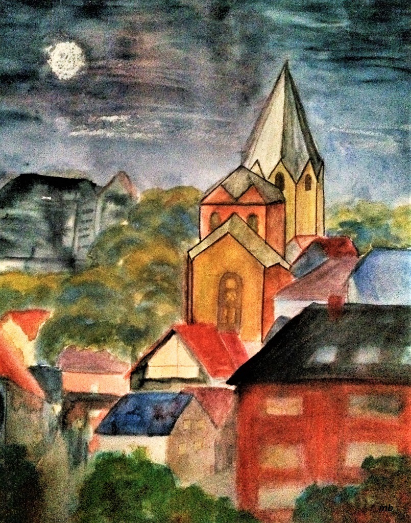 Das Motiv habe ich in mehrerern Schritten erarbeitet, von der Bleistiftskizze, über Aquarell-Entwürfe zum Acrylbild (erste Version, dann übermalt und eine zweite „Endversion“).