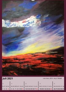 In der letzten Woche haben wir eine Radtour durch Schleswig-Holstein gemacht. So folgt der Kommentar zum aktuellen Kalenderblatt leicht verspätet. Zur Abwechslung habe ich für den Juli ein eigentlich gegenstandsloses Bild aus der Sommerakademie 2019 ausgewählt. Aber so ganz gegenstandlos sind bei mir die abstrakten Gemälde dann doch nicht. Zumindest entsteht beim Malen auf eher zufällige Art dann ein Fantasiebild – häufig auch Fantasielandschaften.