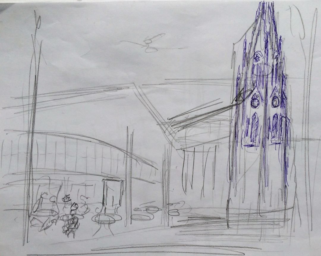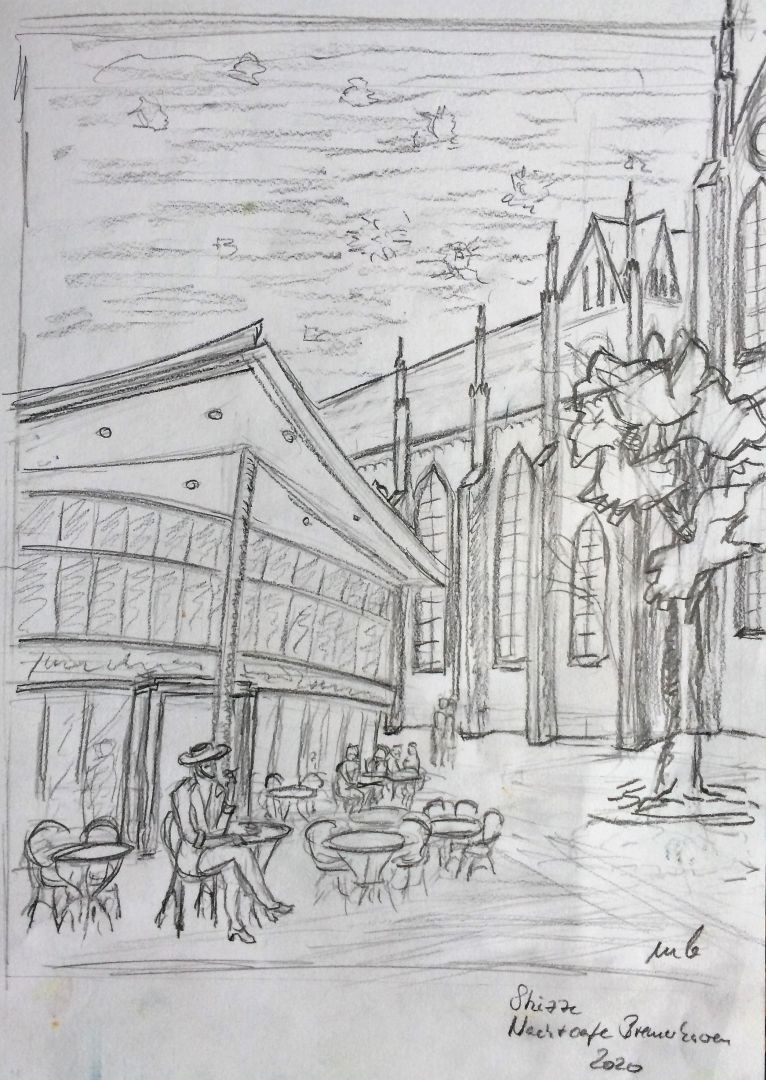 In mehreren Skizzen habe ich versucht Cafe und Kirche so zu positionieren, dass auf der einen Seite die Blau- und Gelb-Anteile ausgewogen sind und auch die Komposition stimmig wirkt. Das Cafe steht in Bremerhaven auf einem großen Platz, zentral und dominant. Aber die große Kirche kontrastiert im Hintergrund ebenso wie bei van Gogh die gegenüberliegende Häuserzeile das helle Licht/Gelb des Cafes. Das Orange der Kirchenfenster verstärkt als Komplementärfarbe das dunkle Blau-violett der Fassade. Und die runde Front des Cafes führt auch hier den Blick in den dunklen Teil des Bildes.