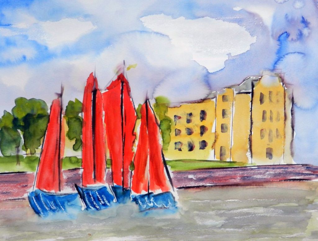Heute ist die NORDSEE Hauptverwaltung in den Fischereihafen in ein neues Gebäude umgezogen und die alte HV wird für die Nutzung durch das AWI(Alfred Wegner Instituts) umgebaut. Die Fassade erhält zur Zeit eine rote Verklinkerung – nicht so rot wie die „erfundenen“ Segel (natürlich sind die Segel im Jachthafen eingerollt und i.d.R. auch weiß) – eher in dem Rot der Kaimauer. Für ein kontrastreiches Aquarell müsste ich heute also auch dem Gebäude eine er- oder empfundene Farbe geben.