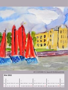 Heute ist die NORDSEE Hauptverwaltung in den Fischereihafen in ein neues Gebäude umgezogen und die alte HV wird für die Nutzung durch das AWI(Alfred Wegner Instituts) umgebaut. Die Fassade erhält zur Zeit eine rote Verklinkerung – nicht so rot wie die „erfundenen“ Segel (natürlich sind die Segel im Jachthafen eingerollt und i.d.R. auch weiß) – eher in dem Rot der Kaimauer. Für ein kontrastreiches Aquarell müsste ich heute also auch dem Gebäude eine er- oder empfundene Farbe geben.
