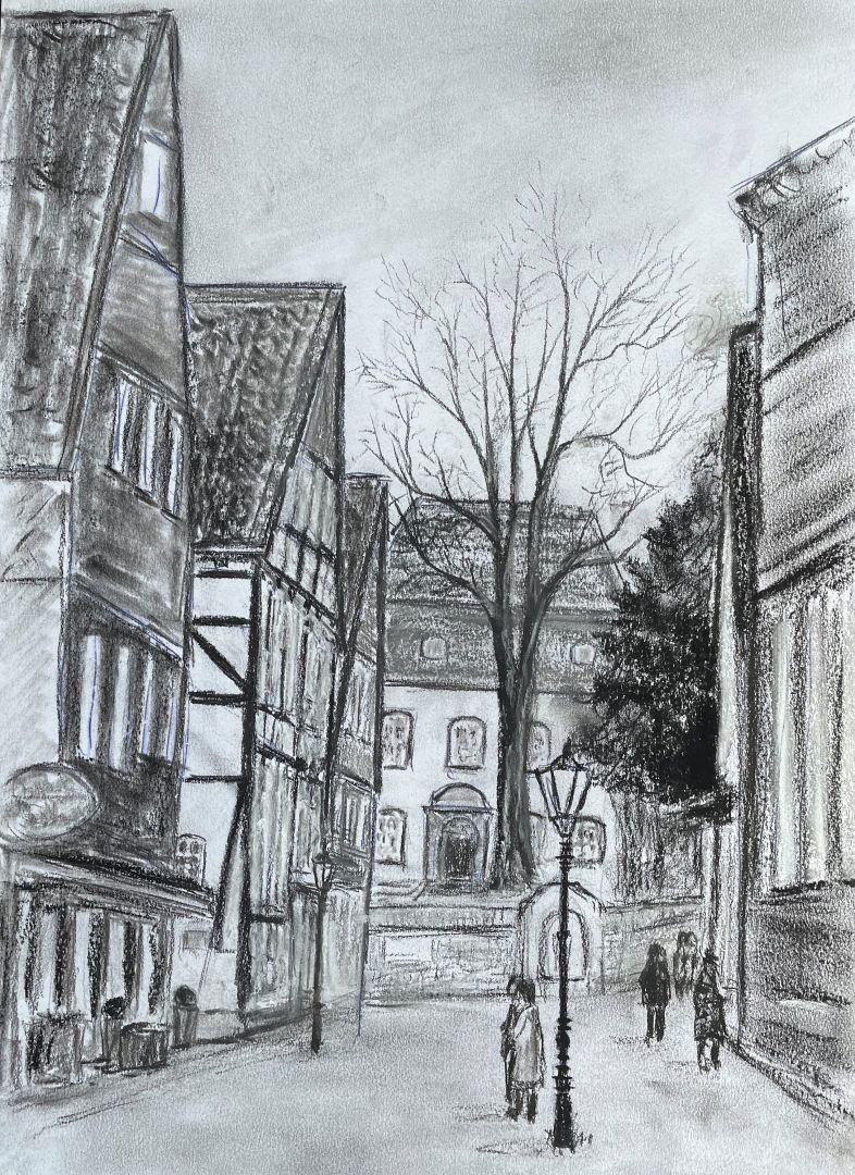 Im Winter 21/22 habe ich an einem offenen Zeichenatelier in der VHS teilgenommen – Dienstagabend 2 Stunden. Gerade soviel Zeit um eine Zeichnung hinzubekommen. Dort ist nicht nur die Wigstrasse entstanden. Seh Dir die anderen Zeichnungen an.