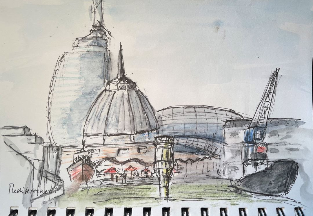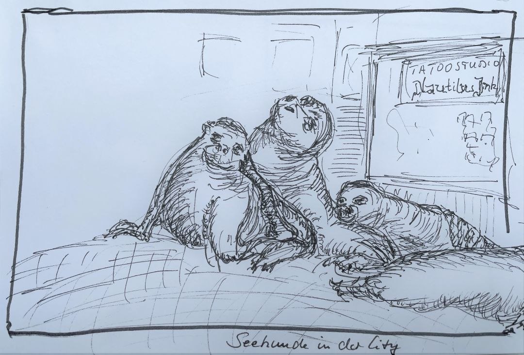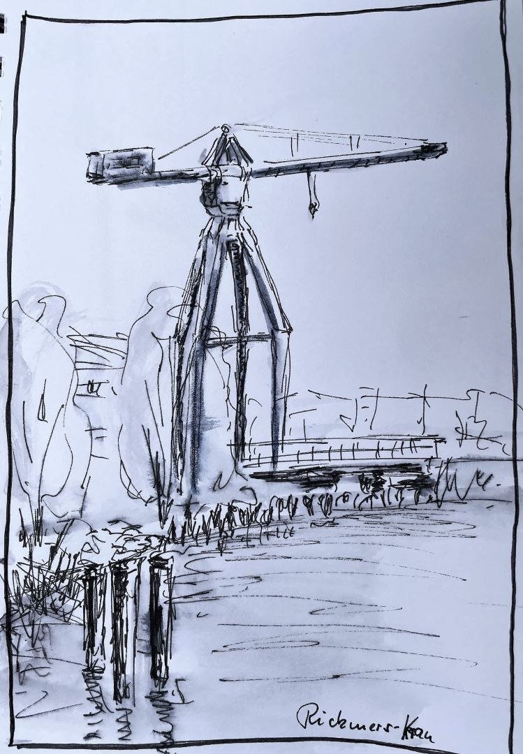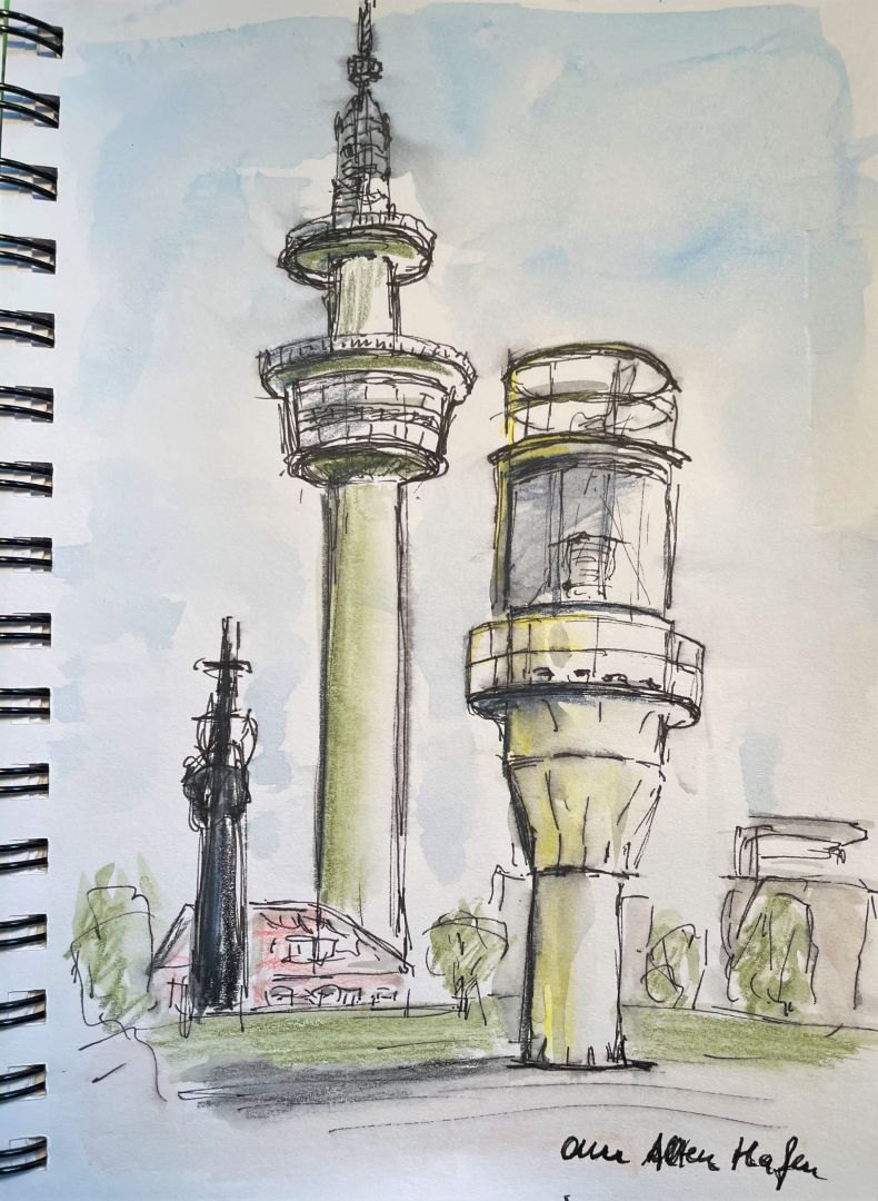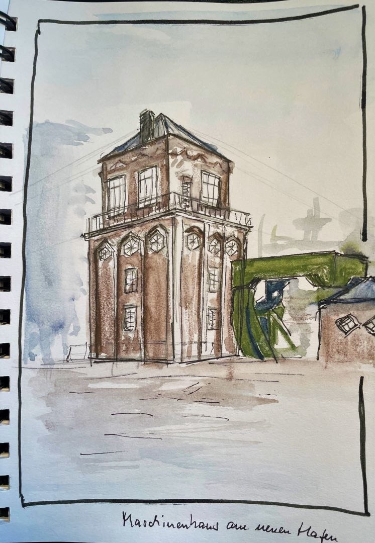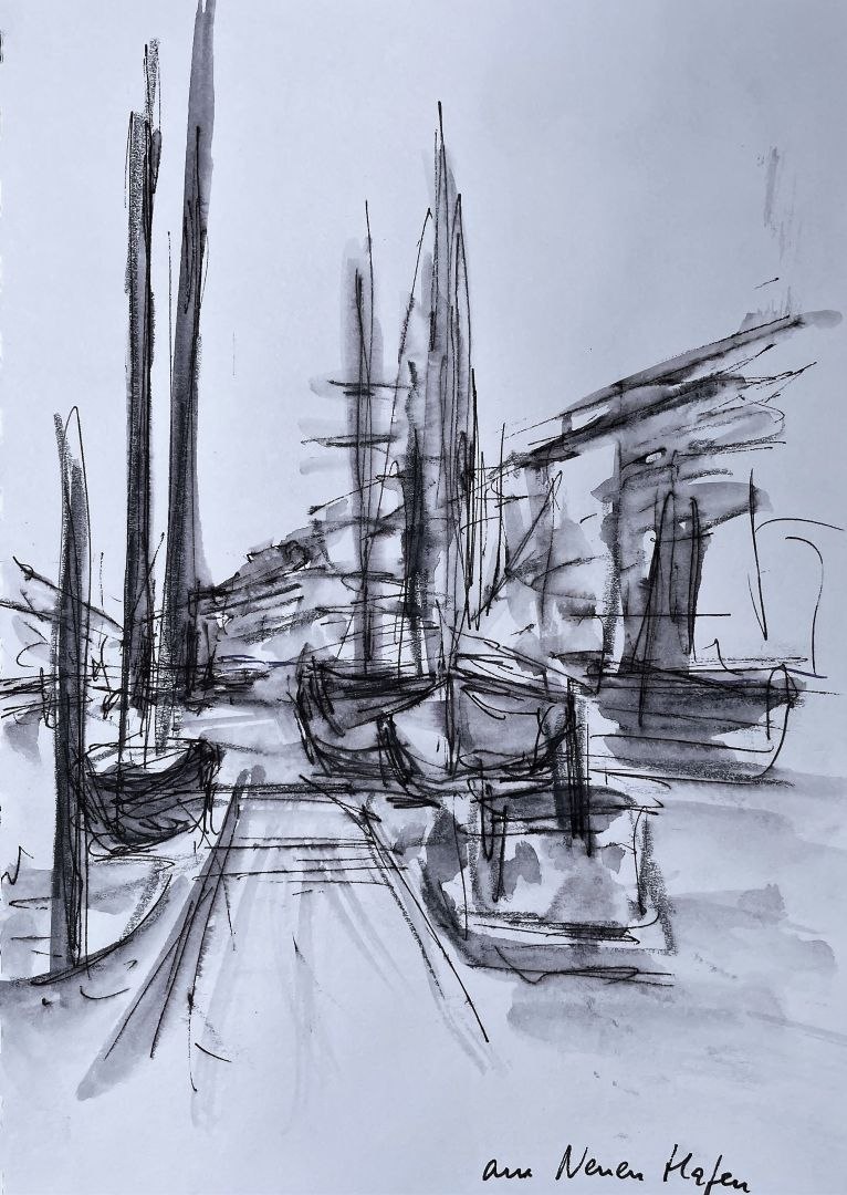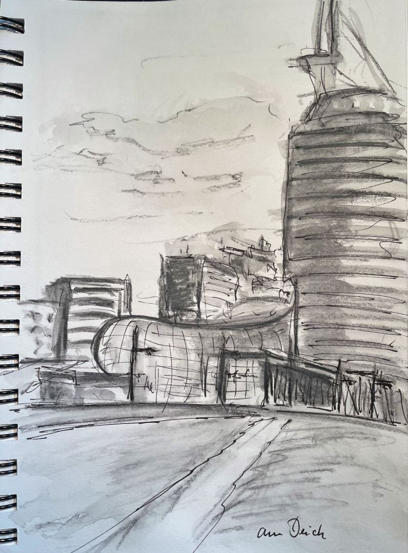 Das war eine perfekte „Sketching-Woche“. Bei bestem, sonnigen – auch manchmal windigem Wetter sind wir mit einer kleinen, harmonischen Gruppe in Bremerhaven unterwegs und fertigen schnelle Skizzen an (3 bis 15 Minuten). Es hat etwas von Urlaub: