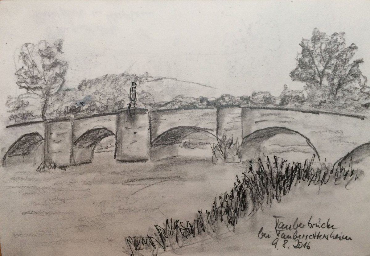 Die  2.Etappe  führt  uns durchs mittlere Taubertal bis Röttingen und zurück. Auf dem Rückweg legen wir in Tauberrettersheim eine kleine Pause ein um eine der typischen Tauberbrücken in einer Skizze festzuhalten.